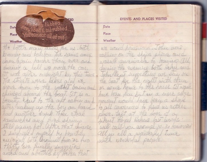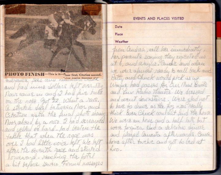 A 1950 travel diary takes us on a journey by train, plane, automobile, and ship. Our author writes terrific entries describing the journey, the parties, the food and drink, and notes many famous people from Hollywood including her best friend, an Oscar nominated actress. An interesting connection to a famous and beloved race horse was discovered from this diary as well!