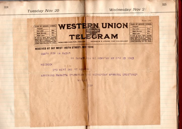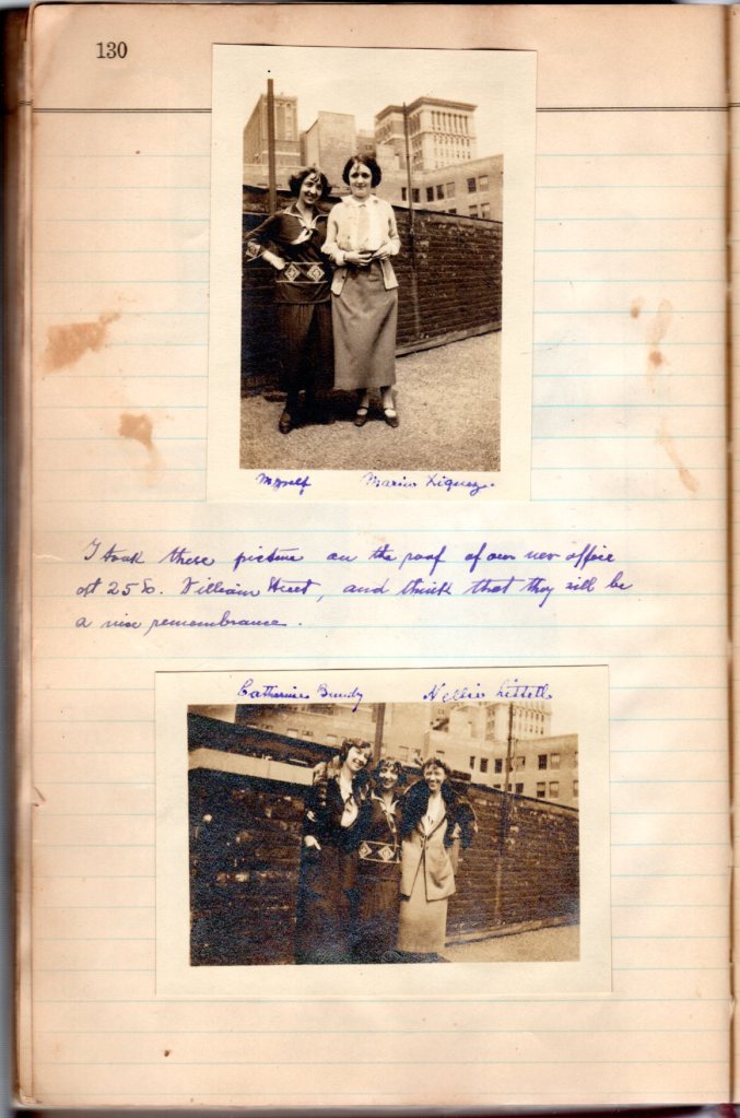 Frieda’s 1923 Diary and Photo. Handwritten inscription under photo reads: “I took these pictures on the roof of our new office at 25 So. William Street and think they will be a nice remembrance.” Frieda is the one on the left in the top photo.