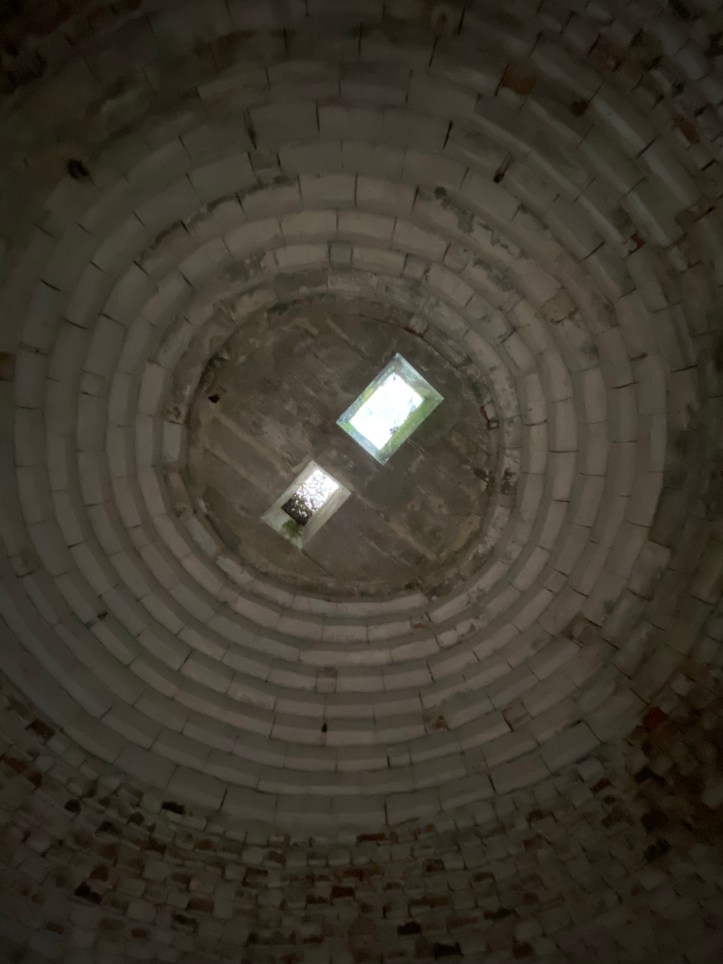 Looking up into the domed ceiling showing skylights. Each block was dated when Henry made it.