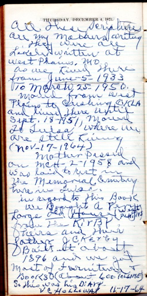 This house in West Plains, Missouri, has a long history of occupants and use, including the birth of 167 babies! One family left most of the furniture, and over 600 books to the next occupants of the home and among the books, was this diary.