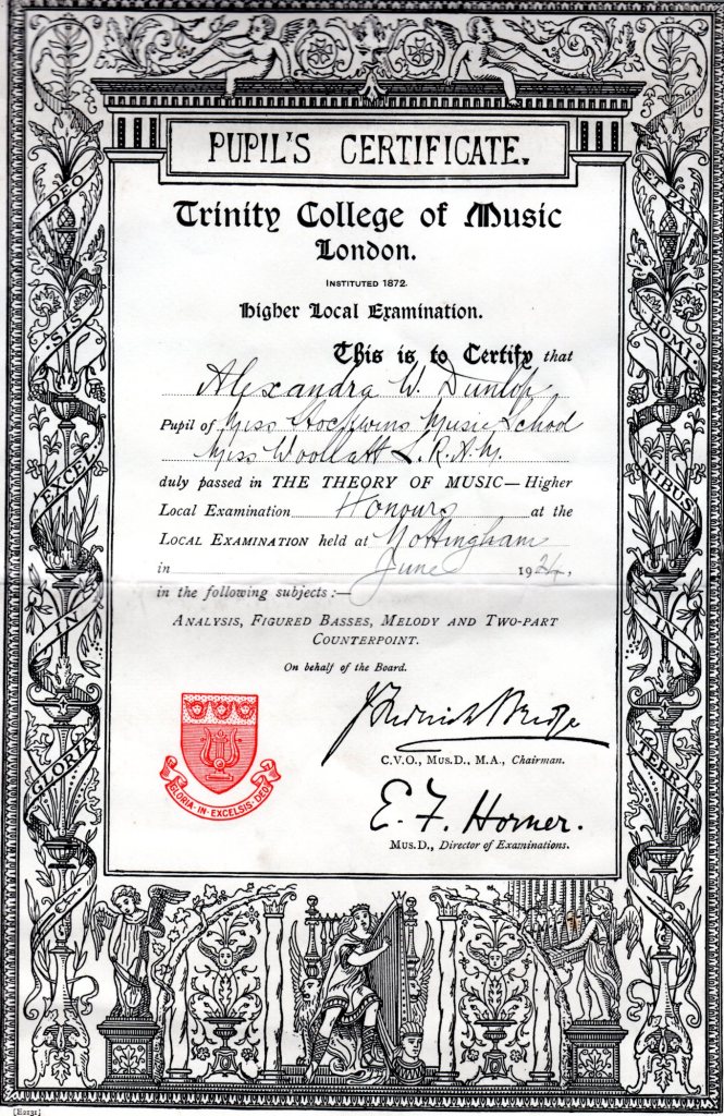 Alexander and Agnes’s Second Daughter Alexandra. The daughter Alexander never got to meet. Her 1924 Certificate from Trinity College of Music London and a painting done of her by her husband, Edward Maurice Feild.