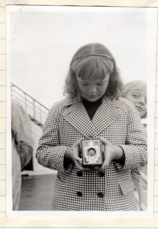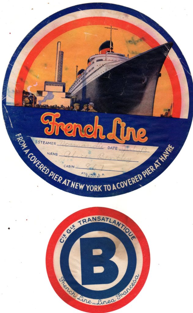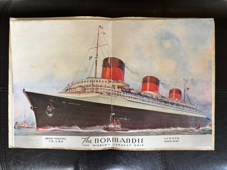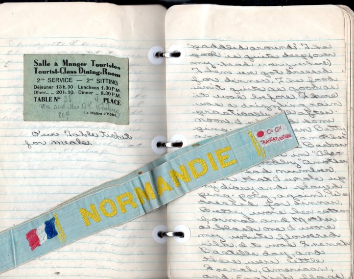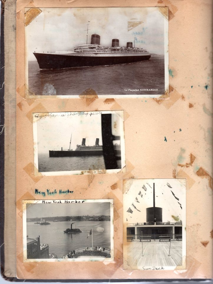 A photo postcard of the Normandie in Alice’s diary. Plus original photos taken by Alice with her $4.35 camera showing the Aquitania pulling out of the dock, the New York Harbor and the top deck of the Normandie.
