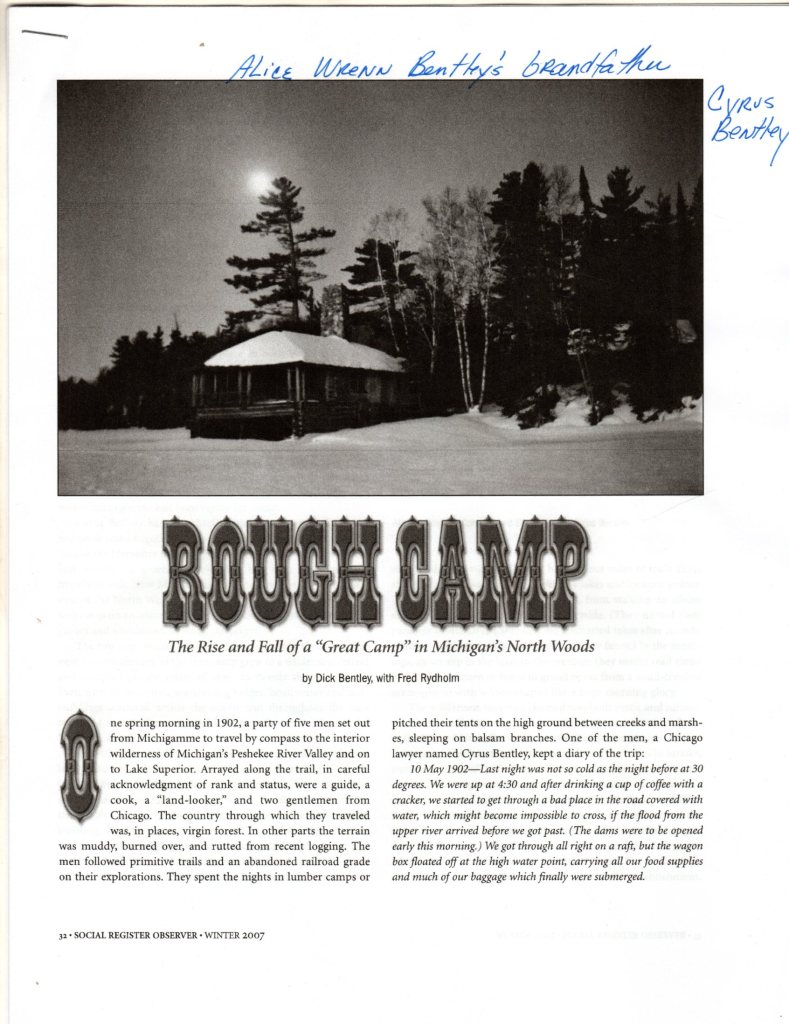 On a very historical side note: in the early 1900’s, Alice’s grandparents, Cyrus and Elizabeth Bentley and their partner, purchased 17,000 acres in the central Upper Peninsula, three miles east of the Baraga-Marquette County line and north of the Peshekee River in Michigan. There they developed a tent camp they called the “Rough Camp.” It eventually contained 17 log lodges, boathouses and outbuildings. The history surrounding their story is simple amazing. You can read a small article concerning this adventure in The Mining Journal at the following link.